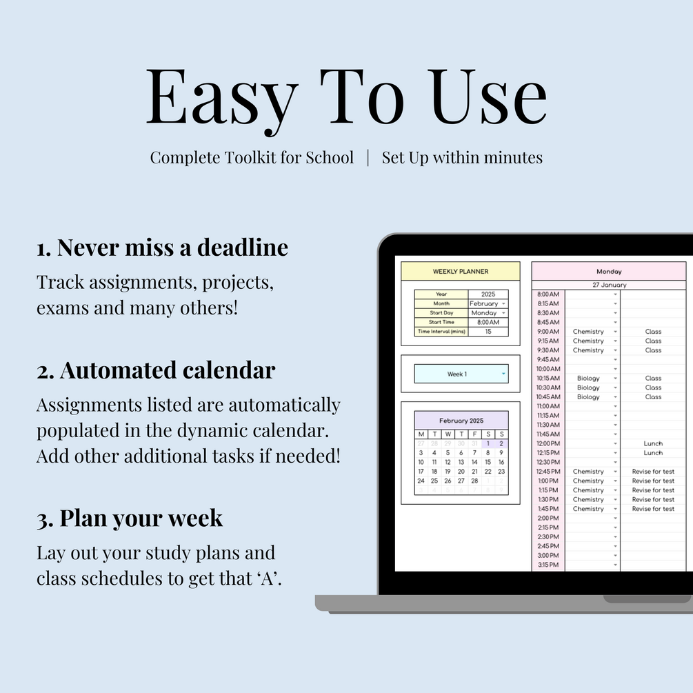 Keep track of assignments, deadlines, and study plans effortlessly with the Assignment Tracker Spreadsheet. Featuring an Example Sheet, a dynamic Calendar, and a Weekly Planner, this tool helps you manage tasks, organize your schedule, and never miss a due date.