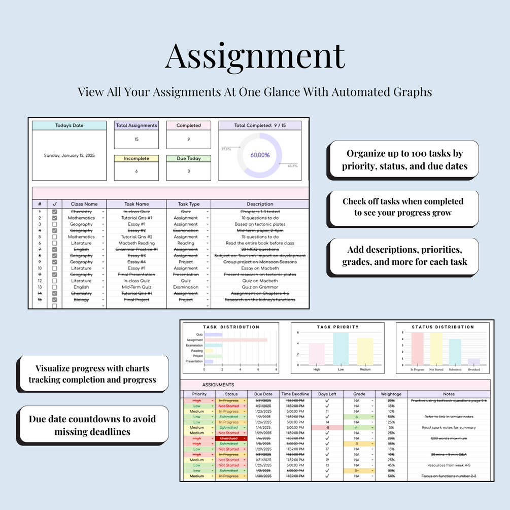 ✔ Assignment Tracker – Add up to 100 tasks with built-in filters