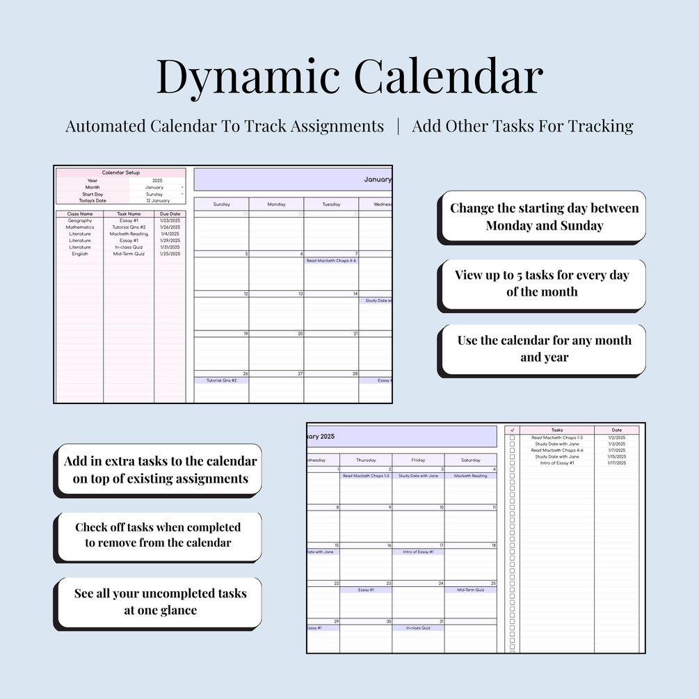 Keep track of assignments, deadlines, and study plans effortlessly with the Assignment Tracker Spreadsheet. Featuring an Example Sheet, a dynamic Calendar, and a Weekly Planner, this tool helps you manage tasks, organize your schedule, and never miss a due date.