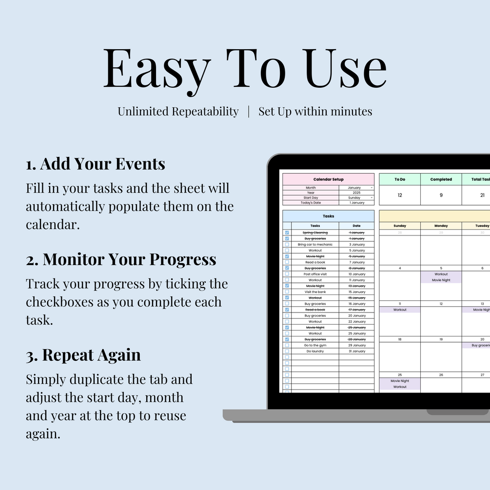 It includes an Example Sheet and a Monthly Planner Tab that you can duplicate for unlimited use. Automatically track events, monitor progress with built-in charts, and stay on top of your schedule with ease.