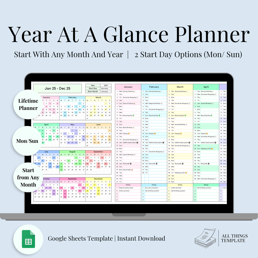 Plan your year your way with the Year At A Glance Planner, a customisable Google Sheets/ Excel template that adapts to school years, fiscal timelines, or any unique starting point. Whether you're tracking academic terms, work projects, or personal goals, this planner lets you choose any start month and week layout (Monday or Sunday) to suit your schedule.